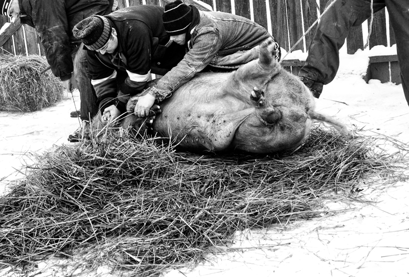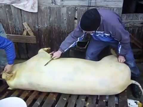 Dopo aver ammazzato l’animale, lo si gira verso est coperto con della paglia e si fa un grande fuoco per eliminare il pelo. Successivamente viene lavato con acqua calda, raschiato con un coltello e infine tagliato. Prima